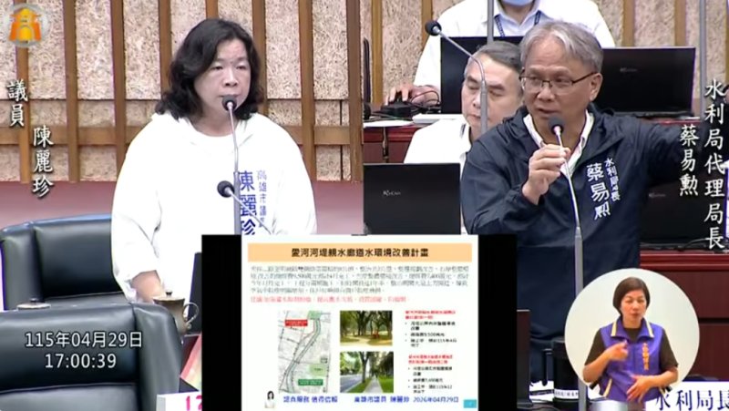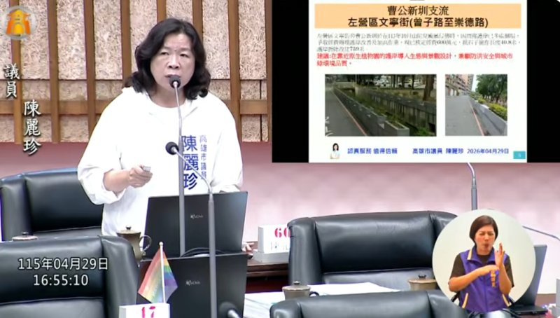 同場質詢中,陳麗珍將焦點轉向曹公新圳支流(左營區文寧街曾子路至崇德路)淹水問題,指出113年大雨期間因擋水牆破損呈現「凹洞式破口」,導致水流外溢淹入住家與原生植物園。她強調,該區已投入約500萬元整治園區環境,若未同步強化防洪設施,將前功盡棄,建議兩側全面設置擋水牆並兼顧美觀設計。