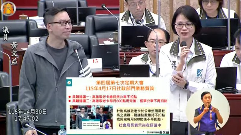 市議員黃文益則針對敬老卡政策提出具體數據,指出114年每月搭乘公車費用超過600元的長者達2,423人,若改為半價扣點,將直接衝擊高使用族群權益,建議維持不扣點,或點數用罄後不再扣點。交通局長蔡淑娟回應,若全面不扣點將涉及龐大財政支出,而點數用罄後不扣點則需長時間系統修改,已將資料提供社會局整體評估。他另指出2.5%刷卡手續費壓縮計程車司機收益,降低裝機意願,要求市府協助與銀行協商調降費率。