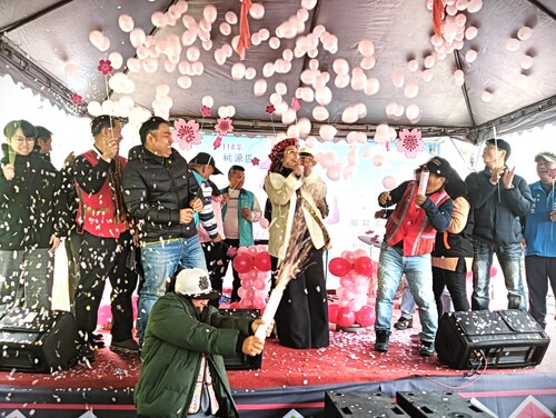 【漾新聞記者黃山高/高雄報導】桃源櫻花公園栽種河津櫻、山櫻、八重櫻與吉野櫻,花季粉紅與白色的花瓣交織如夢,宛如大自然的藝術品,櫻花公園一年一度的桃源櫻花季11日舉辦開幕式,高雄市政府原民會主委阿布斯、市議員高忠德、桃源區長杜司偉、林務局六龜工作站主任林弘基、桃源區代表會主席和里長等釋放氣球和爆花繽紛浪漫出為期一個月的滿山粉紅景致,現場有許多原味市集與原住民音樂演出,帶來獨一無二的遊憩體驗。