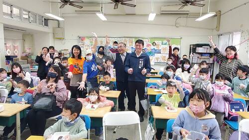 教育局長吳立森此行也參觀了河堤國小的幼兒園寫春聯,適逢國小部今天考試完畢,一年三班利用考完的時間,由學校志工入班教學生與家長用雙語手作草莓大幅,教育局長吳立森與校長杜昌霖也陪同手作,一起體驗DIY美食的樂趣。