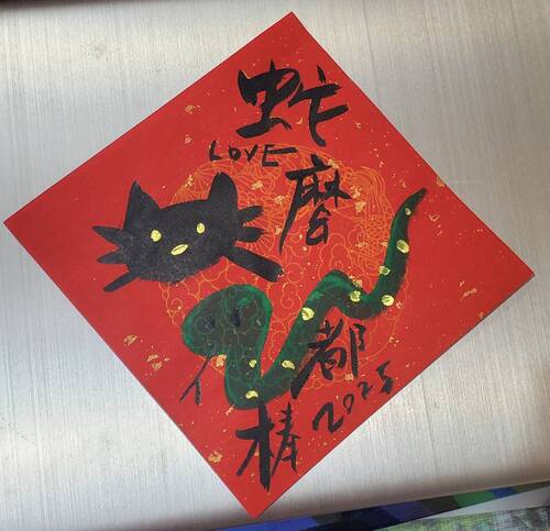 本身就是插畫家「馬里斯」,「藝術家從政」的豐裕里里長謝錫元,他插畫的黑貓、青馬,畫風獨特,配色跳痛到令人驚艷,一直是年輕人的最愛。而今年他再加入「金蛇年」的金蛇元素,大筆一揮,一條「青蛇現形」,再點上雙眼、吐舌,充滿可愛風,就這樣送福氣到家,成為另類創意的斗方,人見人愛,難怪現場一直大排長龍。
