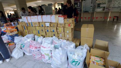 高三飛修科四班學生王思恩也拿著一大箱的罐頭、麵條前來捐贈。他說,在能力允許的狀況下,幫助需要幫助的人,很有意義。他也覺得學校今天辦這樣的活動非常有意義。他也透露,為了這次的活動,班上同學還做資源回收去賣,賺一些錢,然後集資去買這些物資,他也認為,能夠完成這個行善的行動,很有意義。