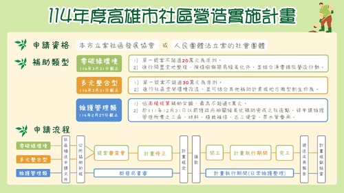 【漾新聞記者陳雯萍/高雄報導】用政府的錢來改造社區,動作要快!為推動社區結合淨零減碳理念的環境營造,高雄市政府都發局推出「114年度高雄市社區營造實施計畫」,提供最高30萬元補助,鼓勵社區居民主動參與環境改善。