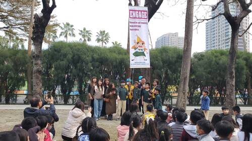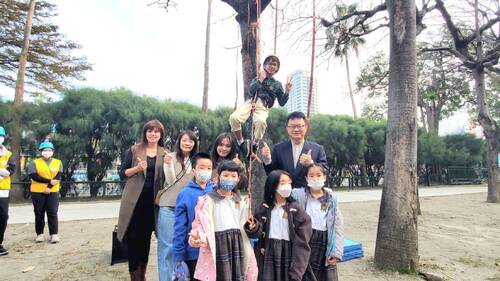 善於利用外部資源,借力使力,校長盧昰余今天也藉由大手攜小手的合作模式,特別邀請兩所大學的教授、大學生前來,除了全程進行雙語的開學典禮,也由實踐大學高雄校區教務長,也是休閒產業管理系主任林保源副教授,帶著已經領有「攀樹」證照的大學生,前來指導學生們如何安全的「攀樹」。