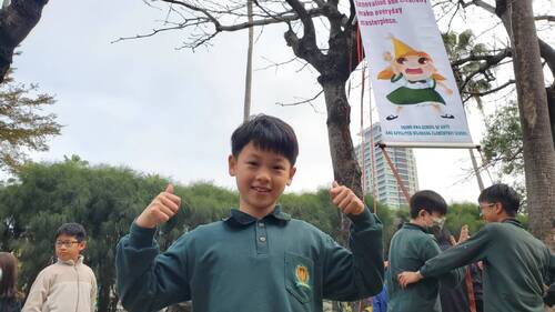 六年級同學林博文今天代表國小部同學進行開學典禮的「攀樹」活動,在攀爬至頂部時,他也打開了國小部開學的精神標語「Innovation and creativity make everday masterpiece.」,立即獲得全場熱烈的掌聲。