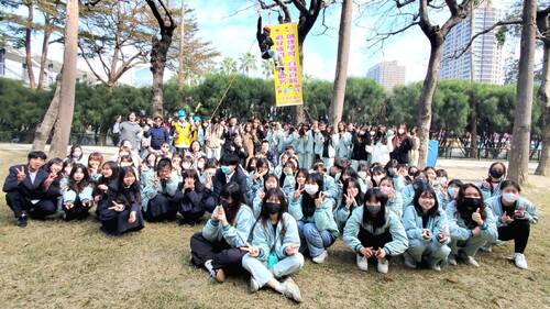 高中部今天則由影劇科主任張漢軒帶領全科的同學前來參加「攀樹」的另類開學典禮,在全體同學的鼓勵下,影劇技術科一年級的黃宇翔也代表「攀樹」儀式,並在大學教授林保源的指導下,一點就通的他,也能現學現賣,小心的打結,並向上一段一段前進,最後,在打開高中部的精神標語「創藝學習,百戰百勝;追分成功,金榜題名。」象徵儀式的達標,也贏來樹下全體同學的熱烈掌聲。