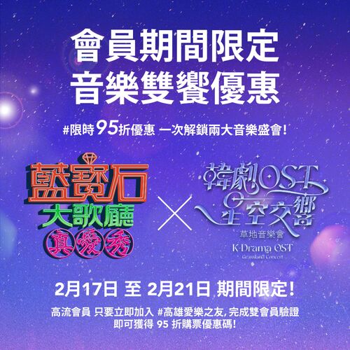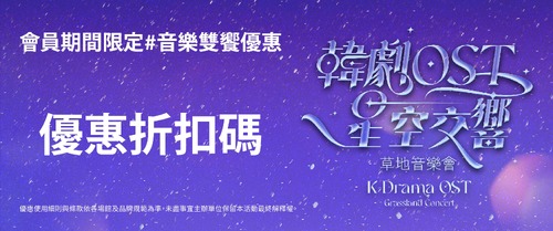 此外,這次的《韓劇OST星空交響》草地音樂會,也與高雄流行音樂中心《2025真愛秀.藍寶石大歌廳》合作,推出期間限定的「音樂雙饗:真愛音樂姐妹會」會員優惠方案,免費加入高流會員和高雄愛樂會員,完成會員綁定認證,於2月17日至21日即可獲得專屬優惠碼、享購票95折優惠!(活動細則與條款依雙方官網及社群公佈為準)
