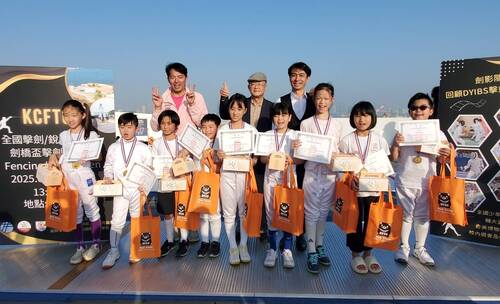 圖/左中校長也是高雄市擊劍人才培訓協會理事長林百鴻(後右)與國家教練林生祥(後左)積極培育擊劍選手向下扎根。(記者陳雯萍攝)