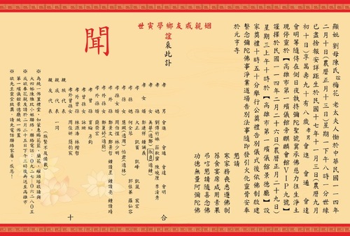 【漾新聞記者陳雯萍/高雄報導】中華全球洪門聯盟、中國洪門五聖山總會長劉會進母親劉陳梅花老太夫人,於2025年2月10日晚間8點默然離世,享齡九十八歲。劉陳老太夫人一生風雨歷練,以堅韌與慈愛發光,充分獲得家人與洪門內外人士的敬重與愛戴。
