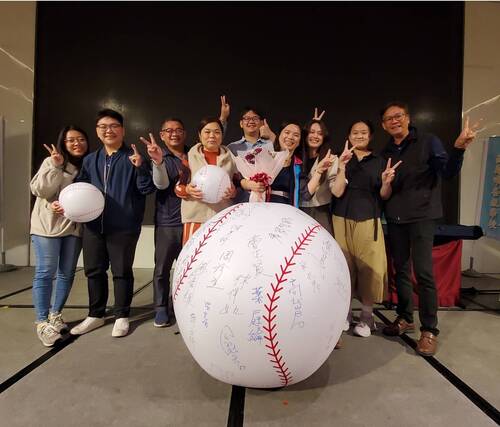 大會最後也祭出彩蛋,拿出一個特大的氣球,由二位協會新舊任理事長張簡智鵬、蔡淑娟與吳立森局長,一起在氣球上簽名。隨後,協會新任理監事、諮詢委員、顧問,也分別上台簽名,象徵新舊任理事長與團隊的交接,揮球成功,棒棒皆強棒!