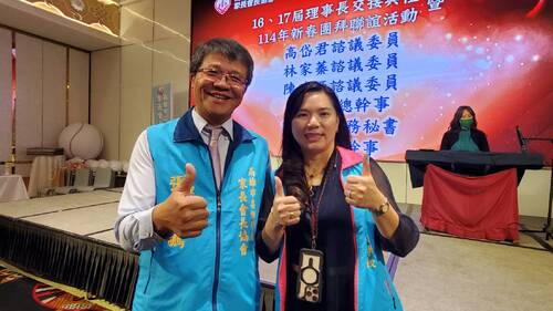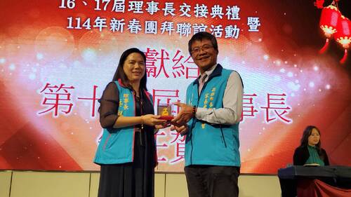 圖/高雄市各級學校家長會長協會第16屆理事長張簡智鵬(左)交棒給第17屆理事長蔡淑娟,交棒成功,棒棒皆強棒。(記者陳雯萍攝)