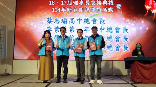 【漾新聞記者陳雯萍/高雄報導】成立27年,是高雄市歷史最悠久的家長協會,高雄市各級學校家長會長協會昨天晚上在林皇宮舉行第16、17屆會長交接典禮,在教育局長吳立森的監交下,由原任理事長張簡智鵬將印信交給新任理事長蔡淑娟,歷任理事長也上台齊聚,象徵經驗傳承,一棒接一棒!