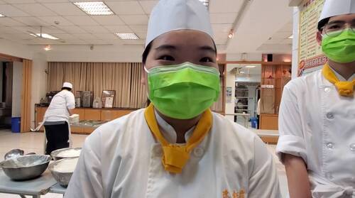 在內場的廚房,廚師打扮的餐管科學生已經用心做好了料理,並將前菜的南洋沙嗲,一份一份擺進了盤子,同學們都抱持著興奮的心情,準備大試身心,讓爸爸媽媽好好品嚐他們的好手藝。