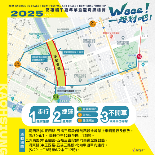 【漾新聞記者陳雯萍/高雄報導】2025「高雄端午龍舟嘉年華暨龍舟錦標賽」將於5月30日至6月1日在高雄愛河(高雄橋至七賢橋段)熱鬧登場。今年活動市集規模升級,擴展至河東路舉辦,將封閉河東路南向車道,僅北向單側通行。高雄市政府運動發展局呼籲市民與選手多利用捷運、公車及輕軌等公共運輸前往,避開交通壅塞。