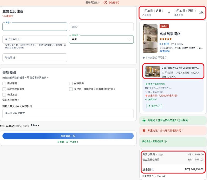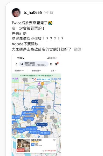 【漾新聞記者陳雯萍/高雄報導】韓團Twice將於11月22日在高雄世運主場館開唱,門票尚未開賣,住宿搶訂風潮已先引爆。近日有網友在社群貼出訂房截圖,質疑「房價飆到一晚14萬多」,引起網路熱議。不少人驚呼是否因演唱會哄抬房價。對此,高雄萬豪酒店回應,該價格為連續兩晚、每晚三間行政家庭套房的總價,平均每間每晚約2.3萬元,並未超出公告定價。