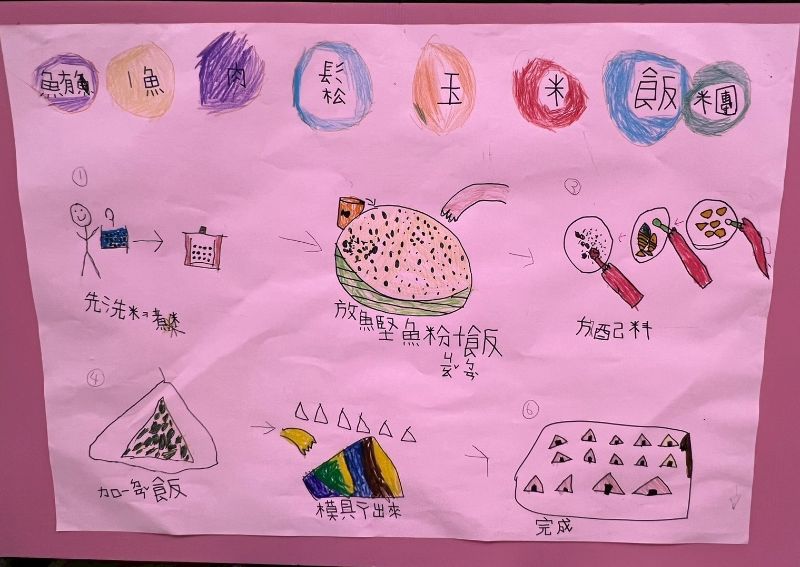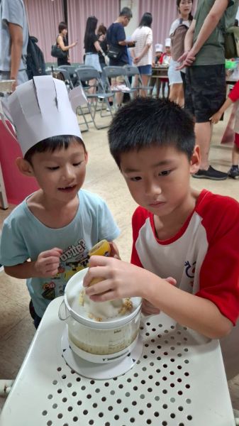 在顏靖芳、蕭惠恩、吳程因三位老師引導下,孩子們透過觀察、比較與創作,從感官體驗轉化為語言表達與動手實作。活動靈感取自韓國節目《黑白大廚》,三組孩子分別負責「鹹」味鮪魚肉鬆玉米飯糰、「酸」味蜂蜜檸檬冰、「甜」味蜂蜜煉乳鬆餅,從備料、介紹到烹調全程參與,自信介紹料理步驟並親手端上桌,化身專業小小大廚。