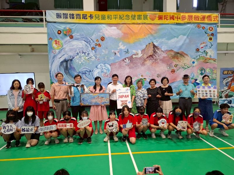 「兒童格爾尼卡國際藝術計畫」源自畢卡索反戰名作《格爾尼卡》,以大型畫布集結全球兒童創作,傳遞和平理念。彌陀國中歷時半年,由蔡友倫老師與藝術家莊雅棟、許翠華及在地長青繪畫班長者共同創作,以台灣山脈與彌陀海洋為意象,融合孩子們對和平、人權與族群共融的理解,成為全臺首所參展的國中學校。
