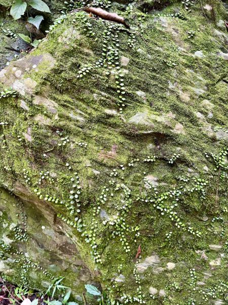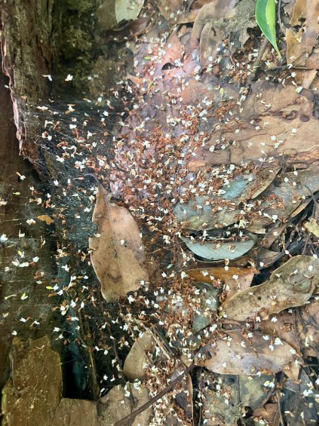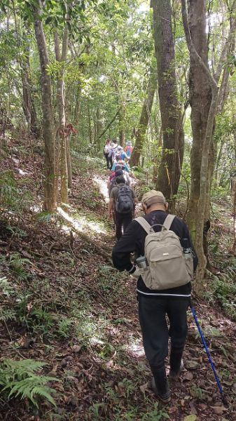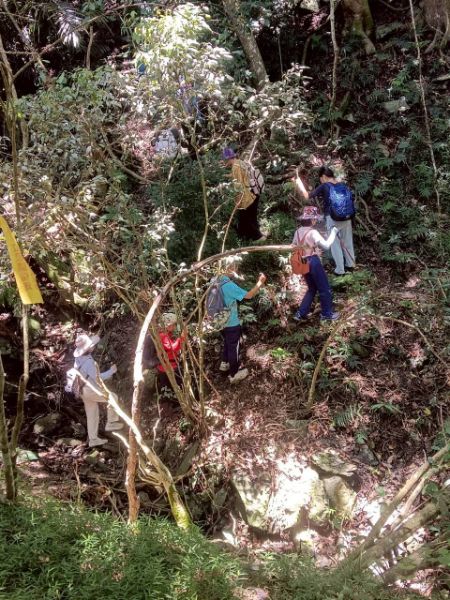 沿著G段原林古道往上攀行,山友們穿越密林與倒木,走過山豬出沒的林徑,腳下舖滿台灣光蠟樹細碎潔白的落花。昨日午後陣雨洗塵,今晨山稜清風徐來,綠意盎然、林蔭蔽日,令人暢快無比。一路行至1383公尺的南美瓏山三角點,再順勢下行,來到傳說中的「1314咖啡園」。