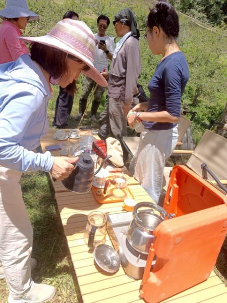 清晨8點半,參與者齊聚「梅礦民宿」,搭上接駁車前往櫻花林登山口,再一路走入海拔1243公尺的演易山莊。剛抵達時,茶園主人葉枝木夫婦已備好黃金色澤的蜜香金萱,帶大家漫遊於茶香四溢的生態茶園。葉枝木說,這款茶湯透亮甘潤,彷彿訴說著他與妻子40多年來在山林深處潛心製茶的故事。