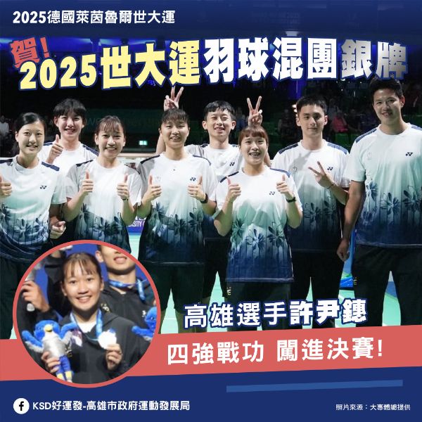 【漾新聞記者陳雯萍/高雄報導】2025年德國萊茵魯爾世界大學運動會捷報傳回,高雄選手高承睿、許尹鏸為台灣爭光!男子桌球團體賽於台灣時間7月21日凌晨進行金牌戰,台灣隊由高承睿、馮翊新、黃彥誠、張秉丞組成的夢幻陣容,以3比2力退中國隊,終結對手連霸夢,勇奪隊史首面金牌,高承睿賽後激動表示:「感謝隊友,大家一起拼下這面金牌!」而羽球混合團體決賽同樣精彩,高雄好手許尹鏸關鍵出擊,助台灣挺進決賽,最終摘下銀牌。