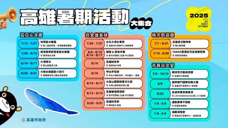 【漾新聞記者陳雯萍/高雄報導】炎炎夏日,高雄化身歡樂樂園,7、8月活動一波接一波,從「旗津風箏節」、「大港閱冰」、「壽山動物園夏日動物季」到音樂演唱會、運動賽事、美食市集、原民祭典等超過百場活動熱鬧登場,邀請全國民眾來高雄High Fun一夏,玩好玩滿!