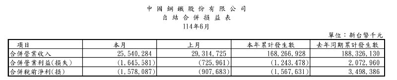 【漾新聞記者陳雯萍/高雄報導】中鋼公司昨(25)日公布114年6月營運數據,累計上半年合併營業收入為1,682億6,692萬8千元,合併營業損失達12億4,347萬8千元,稅前淨損更達15億6,763萬1千元,顯示受鋼鐵需求低迷及價格下滑雙重壓力衝擊,獲利表現不如預期。中鋼指出,本月合併稅前淨損較上月擴大,主因為鋼品銷售量與平均單價雙雙下滑,導致營收減少與營業損失擴大,儘管獲配股利增加推升業外收入,仍難抵主營業務虧損幅度。