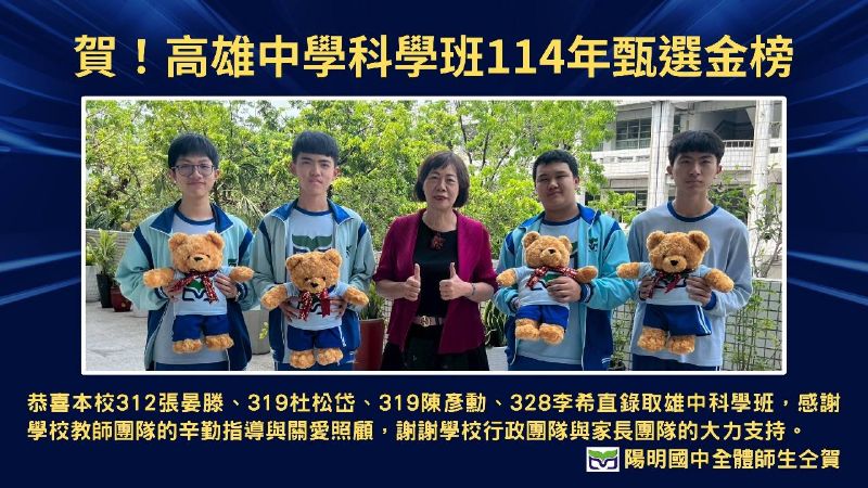 【漾新聞記者陳雯萍/高雄報導】高雄市立陽明國中今年在科學教育與資優教育再創佳績!數理資優班、科學家族及企鵝家族聯手,在高雄中學科學班、高雄女中科學實驗班及雙語實驗班甄選中,共有12名學生脫穎而出,錄取頂尖菁英課程,展現多年深耕資優與科學教育的厚實成果。