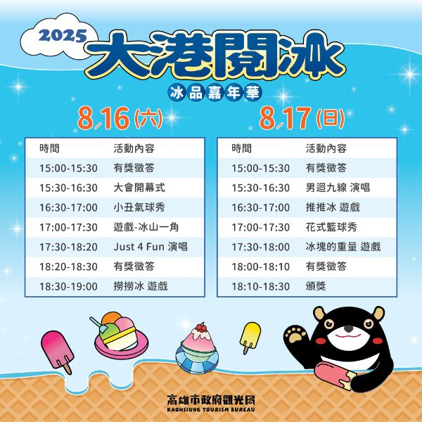 現場還有超值限量「禮冰券」、商家優惠與小旅行活動,邀請民眾邊吃冰邊暢遊港都。同週末的「2025旗津風箏節暨氣墊水樂園」也將吸引人潮,觀光局呼籲多利用大眾運輸與渡輪,以免塞車影響遊興。