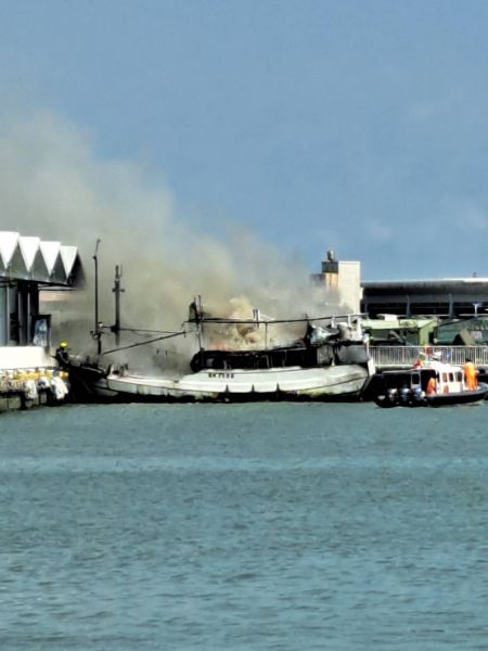 【漾新聞記者陳雯萍/高雄報導】屏東鹽埔漁港今(29)日下午驚傳火警!一艘蘇澳籍漁船停泊於鹽琉線碼頭時,突然竄出濃烈火光與滾滾黑煙,場面怵目驚心。海巡署南部分署第五岸巡隊鹽埔安檢所勤務人員第一時間發現火勢,立即通報東港地區海巡人員並全力投入搶救,同步通知屏東縣政府消防局第三大隊及海巡署巡邏艇馳援,所幸初步清點無人員傷亡。