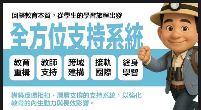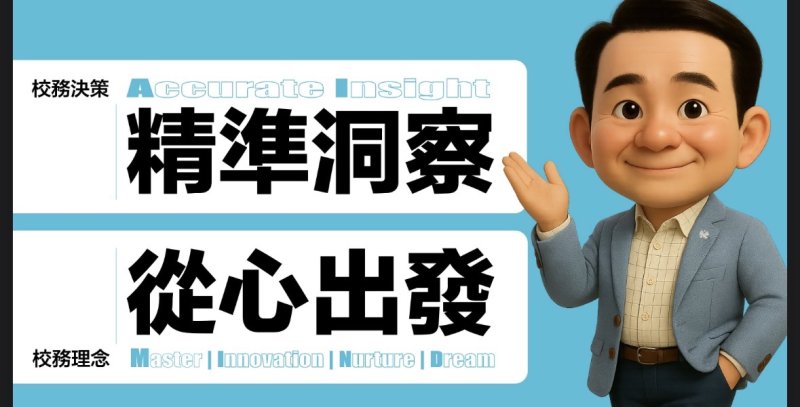 如他在治校理念提出的,領航典範、創新無限、人力培力、夢創未來的四大主軸;在校務決策上,能精準洞察、從心出發。並強調:「全方位支持系統」,讓教育重構、教師支持、跨域建構、接軌國際、終身學習,讓一切回歸教育本質,從學生的學習旅程出發。