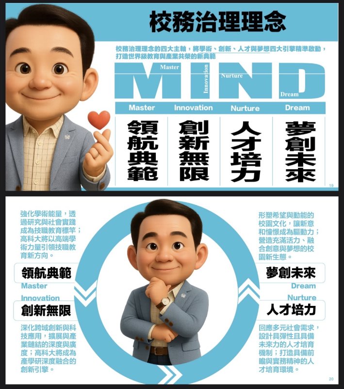 他同時也打造出「打好根基、迎向轉型」、「整合能量、鏈結城市」、「扎根高雄、航向國際」的短、中、長程校務發展目標。並能稟持「創新思考、即刻行動」的校務執行態度;展望未來,期能打造一種全新的治理感「敏捷而不失深度,創新而兼顧永續。」全面整裝待發,迎向高科大下一場深度改革的浪潮!