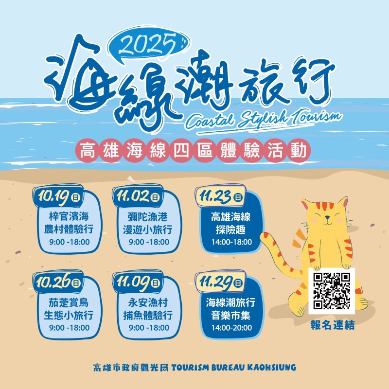 觀光局提醒,活動期間還有更多系列規劃。雙十連假10月10日至12日將於愛河推出「2025高雄愛.月熱氣球」水岸場次,11月8日「高雄乘風而騎」林園場則以「濕地與漁村」為主題,結合單車與生態導覽。民眾可透過「高雄旅遊網」(https://khh.travel)及臉書粉專「高雄海線潮旅行」(https://reurl.cc/1O53XV)查詢詳情,規劃一趟充滿驚喜的海線秋日之旅。