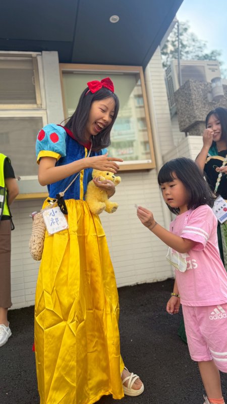 活動現場如夢似幻,實習老師兵華恩、陳妍、何顏安、錢郁均、張伃岑與劉穎祁化身白雪公主、艾莎、貝兒、愛麗兒、仙杜瑞拉與茉莉公主,帶來活潑短劇〈最棒的就是我〉。孩子們全神貫注、隨節奏拍手律動,笑聲此起彼落,連家長也被童趣氛圍感染,臉上滿是笑意。