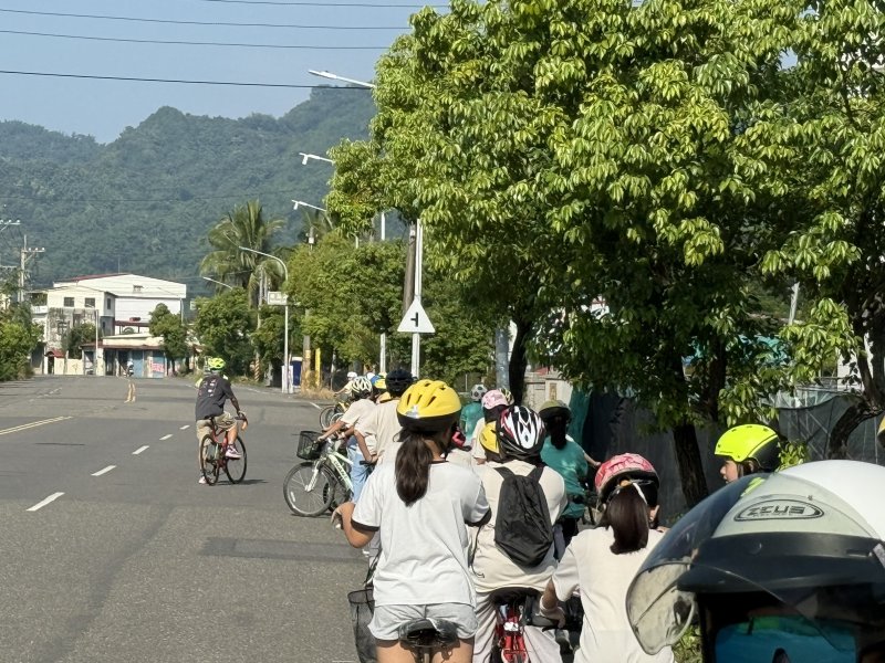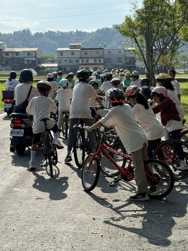 完成筆試與模擬路考後,真正的挑戰才開始——「美濃湖單車道路體驗之旅」。學生們在教師與交通導護志工陪同下,從校門口依序出發,沿開庄巷、民生路一路前行,經過東門冰果室、客家文物館,再轉往美濃湖方向。藍天、稻田、蜿蜒的河堤與孩子的笑聲交織成一幅動人的風景。全程約2.5公里、歷時40分鐘,學生們不只是騎著單車,更在真實的道路上學習「守法」與「禮讓」。