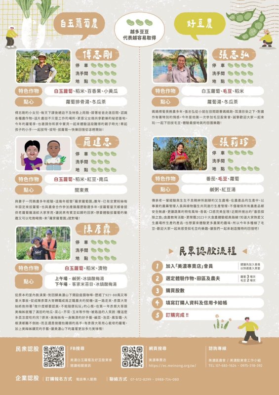 美濃區農會100年起推動「白玉蘿蔔與好豆股東會」,結合親子體驗、食農教育與在地共好理念,今年辦理白玉蘿蔔及毛豆股東認股,由5位具經驗農友分別5個田區規劃耕作,每分地白玉蘿蔔可分割50股、每股800元,約可採收30台斤;毛豆每分地40股、每股800元,約可採收20台斤。股東會活動11月6日上午10時於「美濃專賣店」官網準時開放報名,限量460股,售完為止。