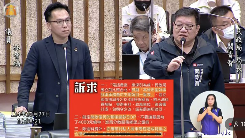 此外,林智鴻也揭露基層報帳制度亂象。有里幹事反映補助電話費卻遭事後要求退回,規範不透明已造成基層人員疑慮與不安。他要求比照台北,將油料、保養等補助項目一一明列,「不要讓里幹事為了4000元報帳傷神」,並盡速訂定「簡政便民」SOP,讓基層能安心服務民眾。