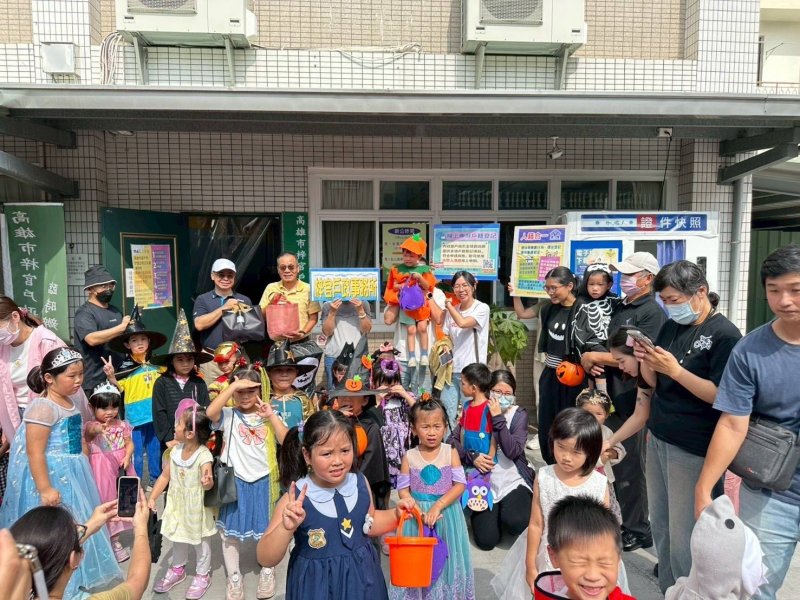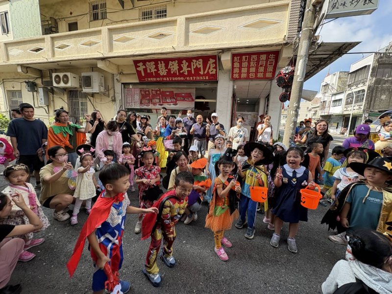 萌鬼們緊接著前往榮獲「2025高雄糕餅比登金獎」的千暉喜餅店,獲得老闆熱情贈送小蛋糕;再到梓官區公所、分駐所、戶政所及歷史悠久梓官城隍廟,小朋友禮貌問候、比出愛心手勢,還在分駐所學到交通安全知識,更嚷著「萬聖節也要守規矩!」童言童語惹得民眾會心一笑。