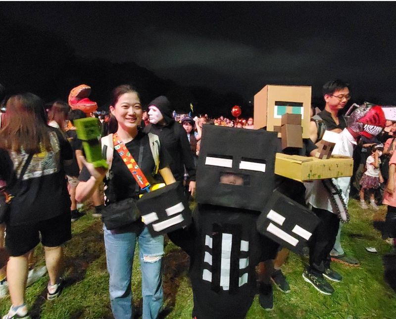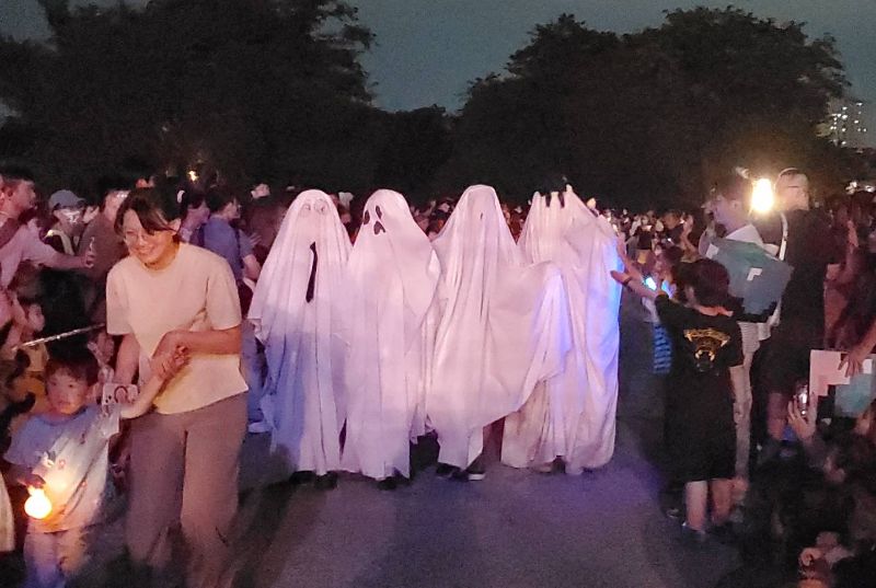 沿途滿是吸睛造景:南瓜燈綻放光芒、骷髏人搖擺巡場、巫師帽在夜色中閃爍。親子家庭紛紛扮裝出動,萌娃魅力滿分;年輕人則緊跟K-pop潮流,化身獵魔女團、Saja Boys男團等人氣造型,街道瞬間變身為時尚萬聖大舞台,高雄化為最潮嘉年華之城。