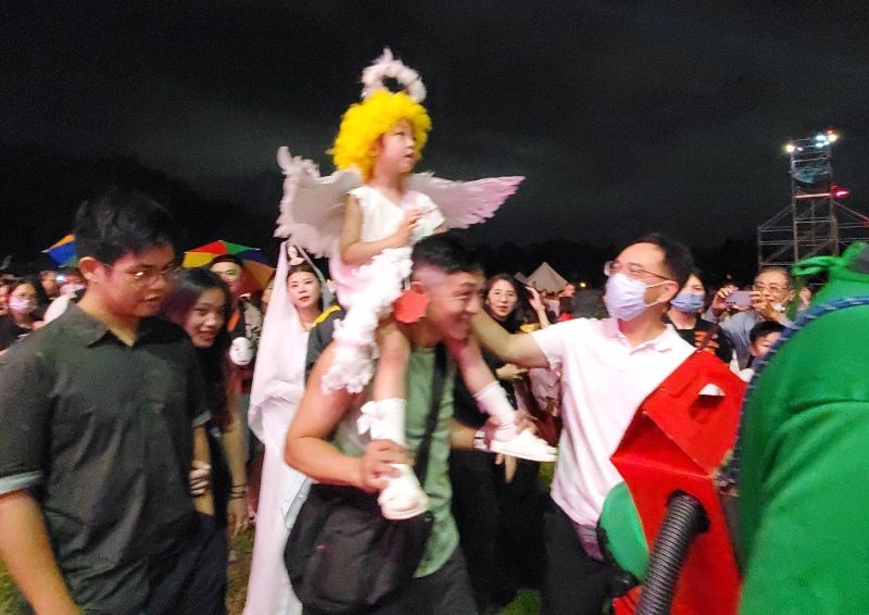 【漾新聞記者陳雯萍/高雄報導】「2025高雄萬聖節」今晚(1日)歡樂爆棚!衛武營藝術文化中心湧入超過7萬名民眾與親子參與創意裝扮遊行,全天人潮更高達30萬人次。高雄市長陳其邁驚喜化身「演唱會工作人員」,別上耳麥、戴上黑帽子,以「地味萬聖節」風格致敬辛勞幕後團隊,也為高雄「演唱會經濟」再添熱度。沿途與大小朋友揮手合影、撒糖果,現場驚呼連連、笑聲四起,氣氛嗨到最高點!