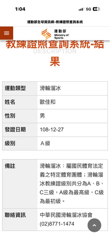 陳麗娜同時也出示今年114年第47屆中正盃全國溜冰賽的秩序冊,當中,有一位桃園的領隊與管理,一位高雄市的選手、一位管理;還有一位金門縣的選手。