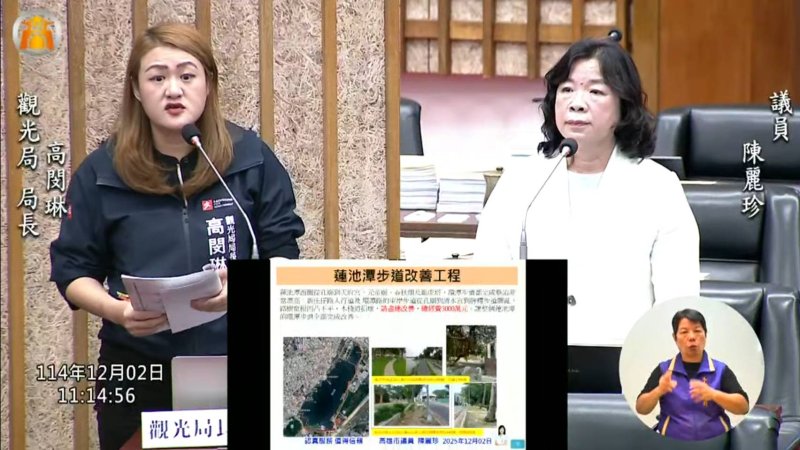 針對蓮池潭周邊景觀,陳麗珍指出,蓮池潭西側從孔廟至天府宮、元帝廟、春秋閣、龍虎塔等路段已整治完備,環潭景觀煥然一新,但東側從孔廟到清水宮、牌樓一帶仍髒亂不堪,步道凹凸不平、木棧道損壞,路樹竄根嚴重影響行走安全。她要求觀光局儘速向中央爭取約3,000萬元經費,完成東岸全線改善。觀光局長高閔琳回應,將於明年度辦理經費爭取。