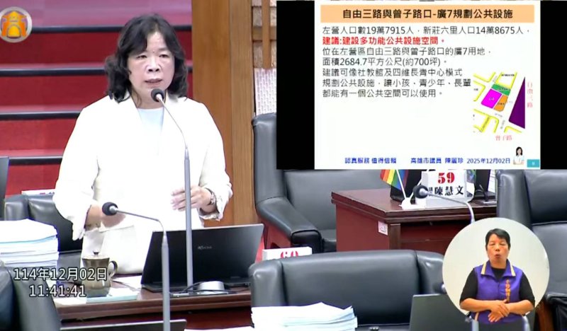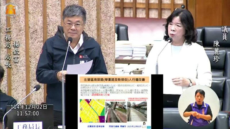 在人行道整建方面,陳麗珍點名左營區南屏路(華夏路至新榮街)、曾子路(博愛三路至自由三路)以及楠梓區德民路(外環西路至高楠公路)三處路段分別總長930公尺、544公尺與2.53公里,過往僅局部修補,導致坑洞、破損嚴重、行人難以安全通行,要求工務局儘速整段辦理改善。工務局長楊欽富回應,將向中央爭取經費,並加速納入施作。