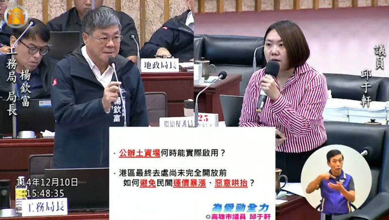 在營建剩餘土石方管理上,林欽榮說,市府成立跨局處平台檢視短中長期去化機制,並與中央研議港區整地模式,相關《高雄市營建工程剩餘土石方管理自治條例》修正版已送入議會審議。截至12月5日,港區整地計畫已收受149車次、2,030方土石,逐步紓解流向壓力。在涉及《水土保持法》的案件中,市府也已勒令停工並取消第二期水保計畫,後續全案持續由檢調偵辦中。