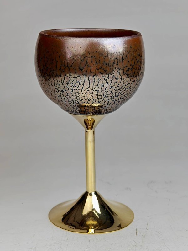 張桂維透露,「聖杯」概念萌芽於十多年前閱讀聖經時,對於「若以聖杯承載,飲下致命之液也無害」的經文深感觸動。他以此為靈感,結合建盞技藝與高溫鐵質磁化原理,讓杯體釉色呈現金屬般流光,更擁有使水質由弱酸轉為弱鹼、分子更細緻柔順的特殊效果,彷彿承載物質轉化與祝福的象徵力量。這項獨特工藝使每只杯子成功率僅約1%,堪稱以火與時間鍛成的藝術珍品。