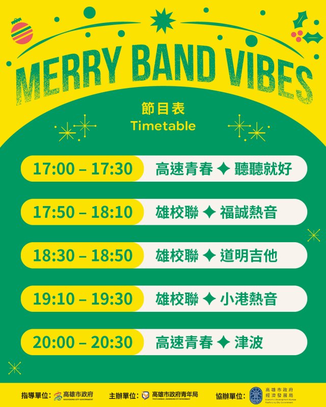週六下午五時至晚間八時三十分登場的「Merry Band Vibes」,由青年局「高速青春-音樂培力計畫」培育樂團領軍,包含「聽聽就好 Just Listen」、「津波 Tsunami」率先開唱,接續串聯雄校聯校園音樂能量,福誠高中熱音社、道明中學民謠吉他社與小港高中熱音社輪番上陣,青春旋律在城市街頭流動。