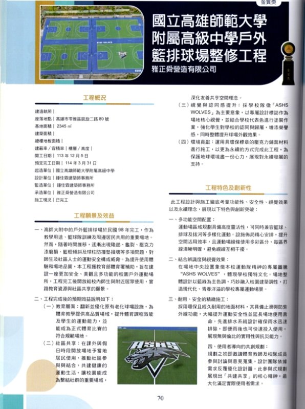 國立高雄師範大學附屬高級中學以「高師大附中戶外籃球場整修工程」,榮獲B建築工程類公共工程建築物金質獎,讓一座老球場,成為安全、美感與品質兼具的校園新地標。