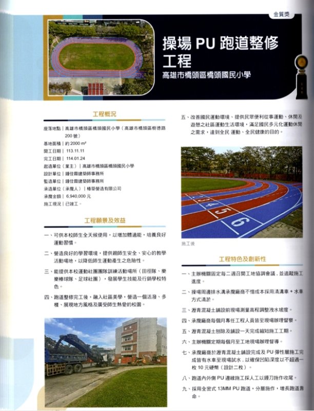 鍾佳霖表示,橋頭國小工程最大的挑戰,在於如何兼顧施工效率與品質細節,從瀝青混凝土刨除到PU彈性層鋪設,每一道工序都必須反覆檢測。透過嚴謹的品質管控,跑道平整度大幅提升,排水坡度問題也獲得徹底改善,讓孩子能在安全、安心的環境中自在奔跑,能獲得金質獎肯定,是團隊莫大的榮幸。