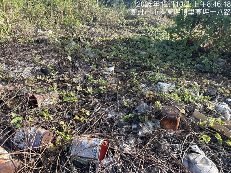 許采蓁指出,該處位於小港區高坪三十八街,她翻出2022年的街景圖畫面,地面已可見散落垃圾,而現場還綁著高雄市環保局寫有「禁止亂丟垃圾」的紅色布條,畫面形成強烈反差,顯得格外諷刺。她強調,這並非短期棄置,而是長時間累積的環境問題。