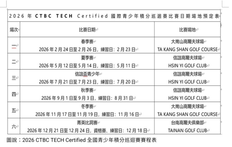 【漾新聞記者陳雯萍/高雄報導】結合產官學力量、串聯國際積分體系的「2026 CTBC TECH Certified全國青少年積分巡迴賽」,正式啟動。在高雄市政府運動發展局指導下,由臺灣青少年高爾夫協會、高雄市青少年高爾夫運動發展協會攜手中信科技大學高爾夫國際學院共同舉辦,首站將於2026年2月24日在高雄大崗山高爾夫球場揮桿登場,為南部青少年高爾夫寫下嶄新里程碑。