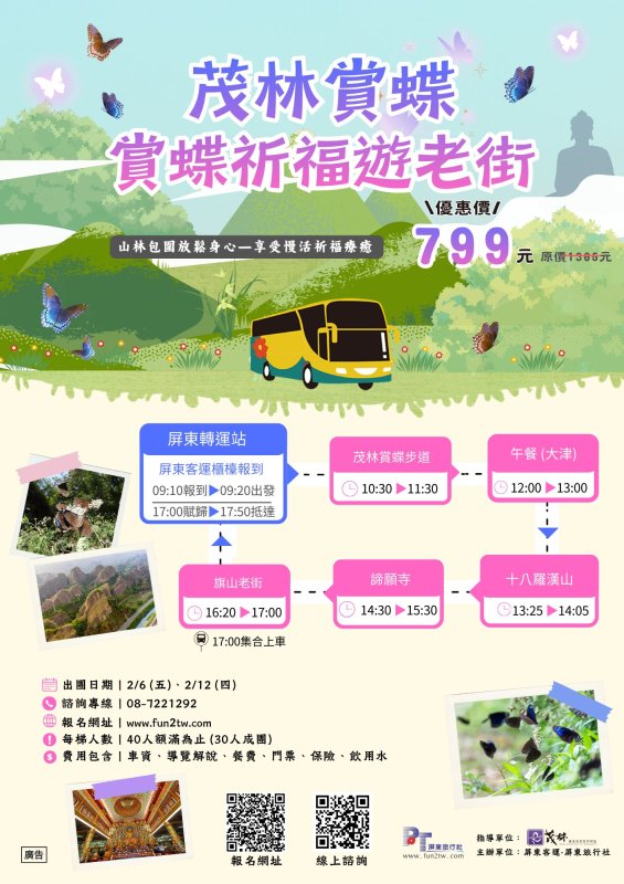 「2025-2026茂林賞蝶主題遊程專車」即日起全面開放報名,歡迎把握冬季限定時機走進茂林、六龜,近距離感受紫斑蝶飛舞感動時刻還有暖心療癒好湯,茂管處官網 https://www.maolin-nsa.gov.tw或茂管處 Facebook 粉絲專頁「Fun心遊茂林」https://www.facebook.com/Fun.Maolin/。